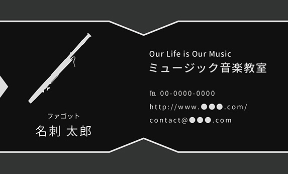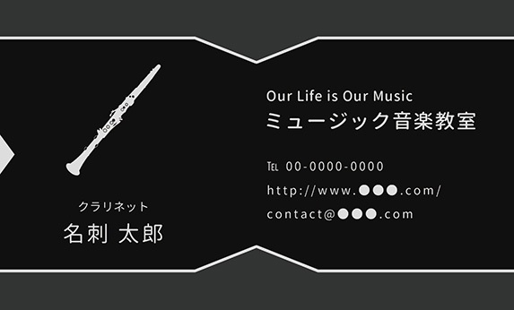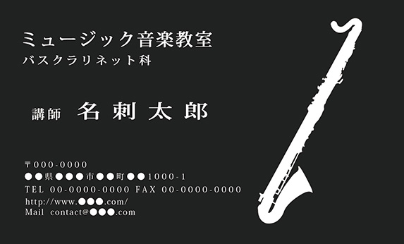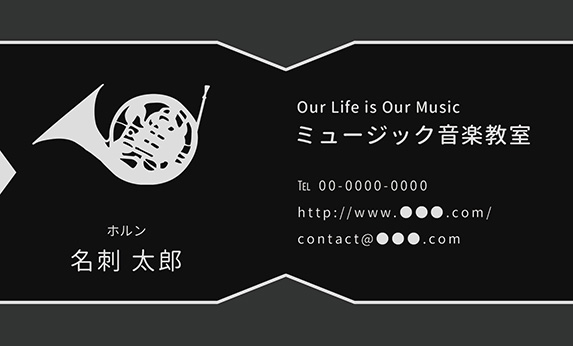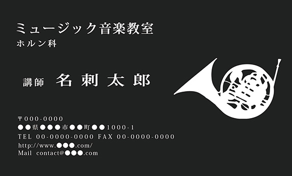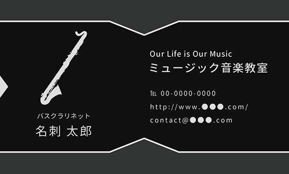 ブラックカラーの名刺に、ホルンやバスクラリネットといった楽器のイラストが素敵な音楽名刺です。