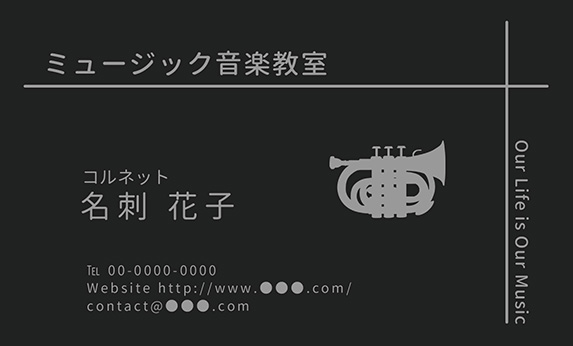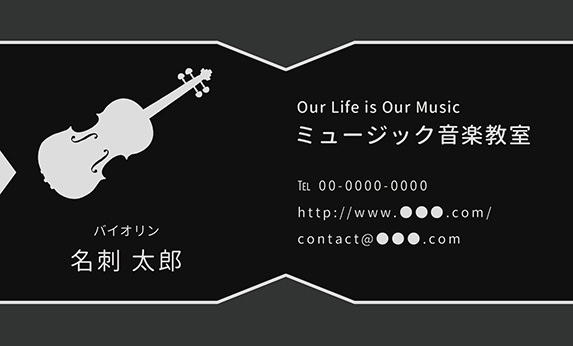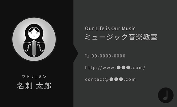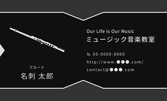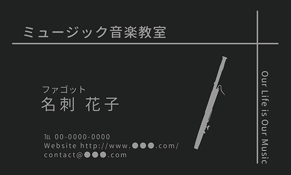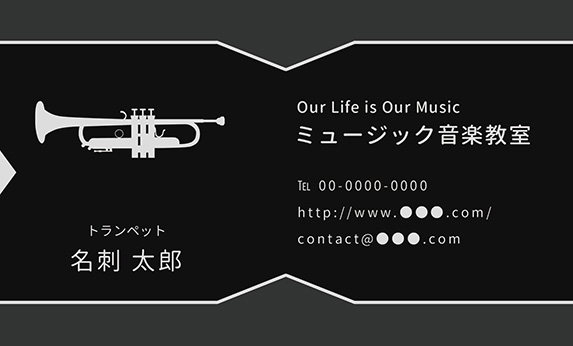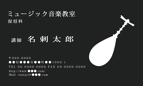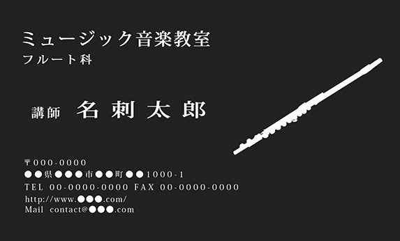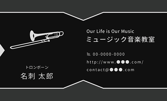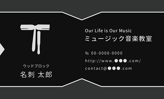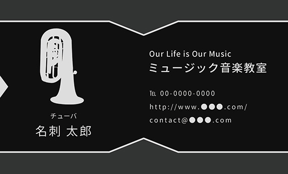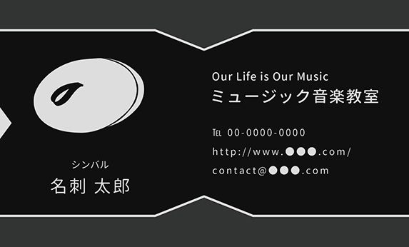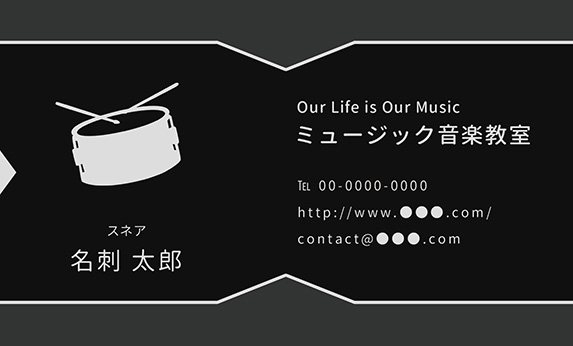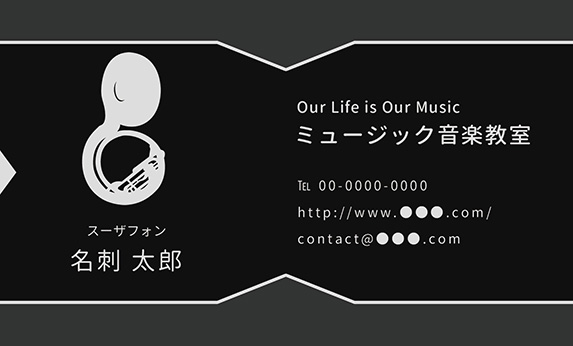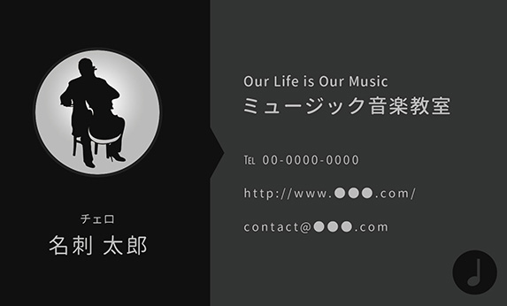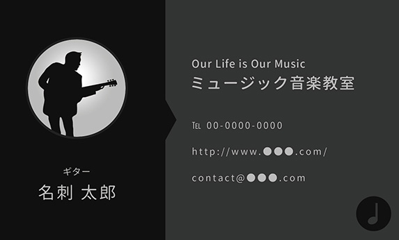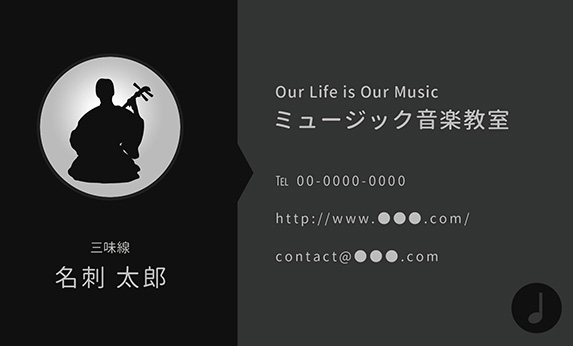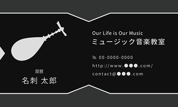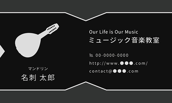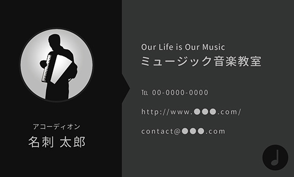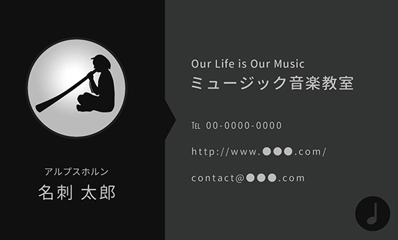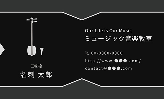 シンプルなブラックカラーに楽器のイラストがワンポイント。素敵な音楽系名刺です。
