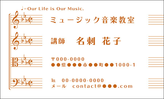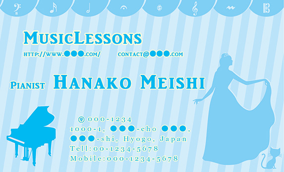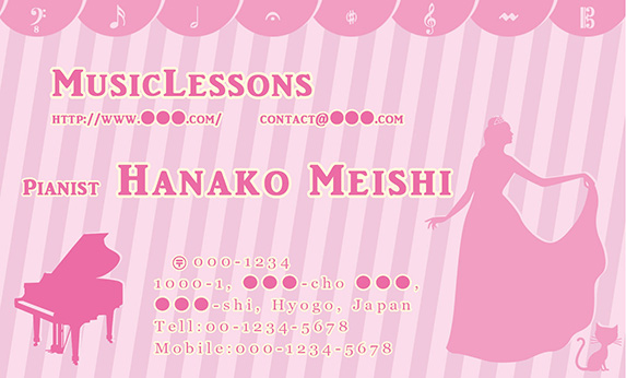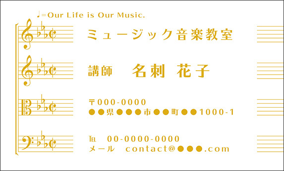 ト音記号や音符がデザインされた名刺です。華やかな色合いと素敵な音楽デザイン、そして小さく可愛らしくデザインされた子猫が素敵ポイントです。