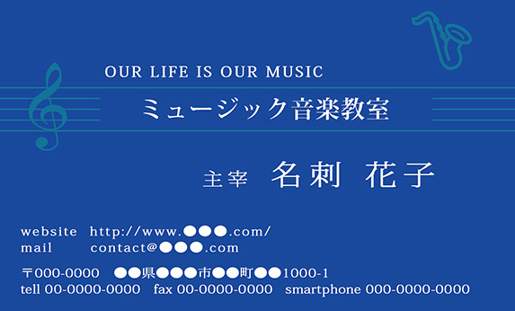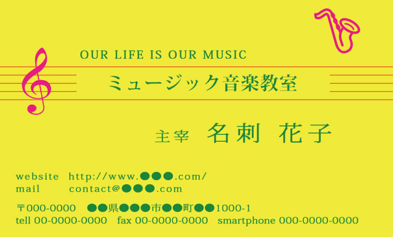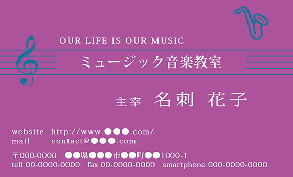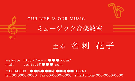 バイオリンやソプラノサックスなどさまざまな楽器のイラストの名刺です。他のイラストも制作が可能です。