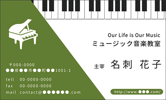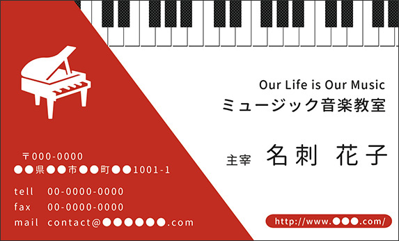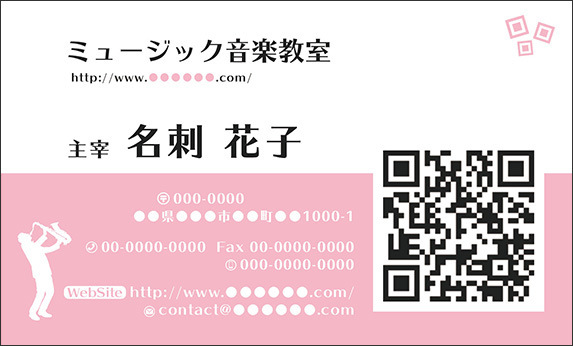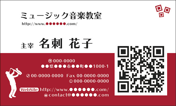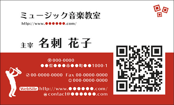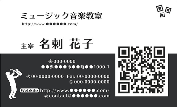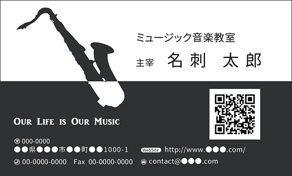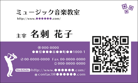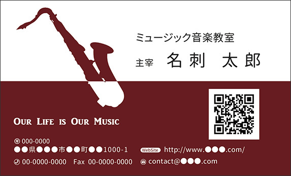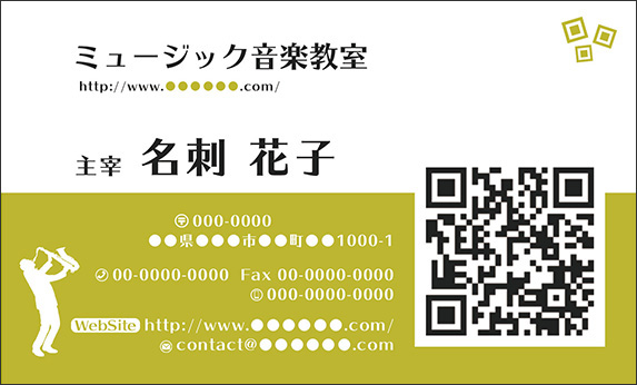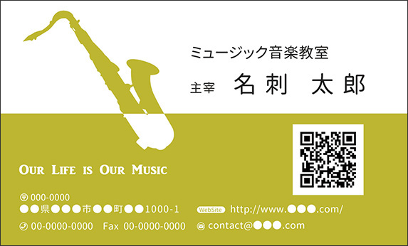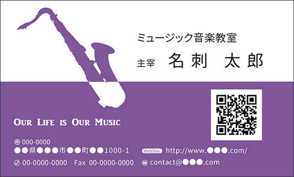 音楽家であることが一目で伝わる楽器のイラストとホームページアドレスなどを収納できるQRコードが特徴的な音楽デザインの名刺です。楽器のイラストは他の楽器に変更することができます。