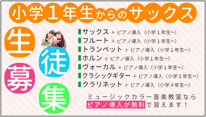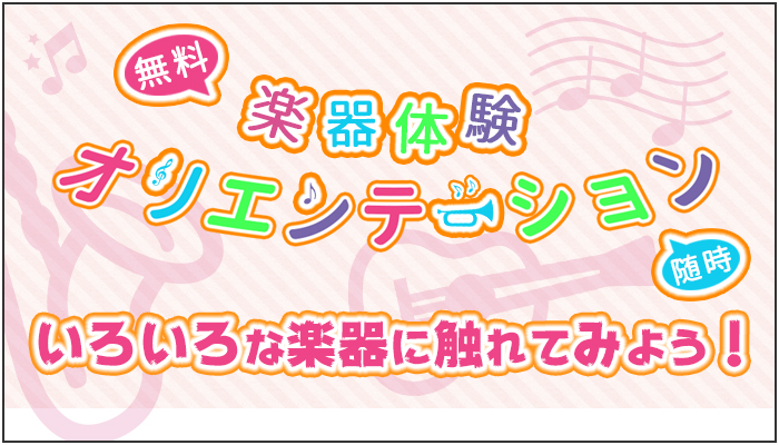 ミュージックカラー音楽教室では、楽器体験・楽器オリエンテーションを随時実施しています。ピアノ、フルート、サックス、クラリネット、トランペット、ギターなどいろいろな楽器に触れてみて、自分のやりたい楽器を見つけてみよう!予約制です(当日予約OK)、お電話もしくはメールでお問い合わせください。